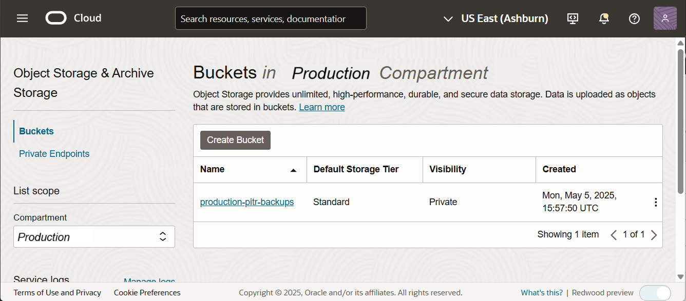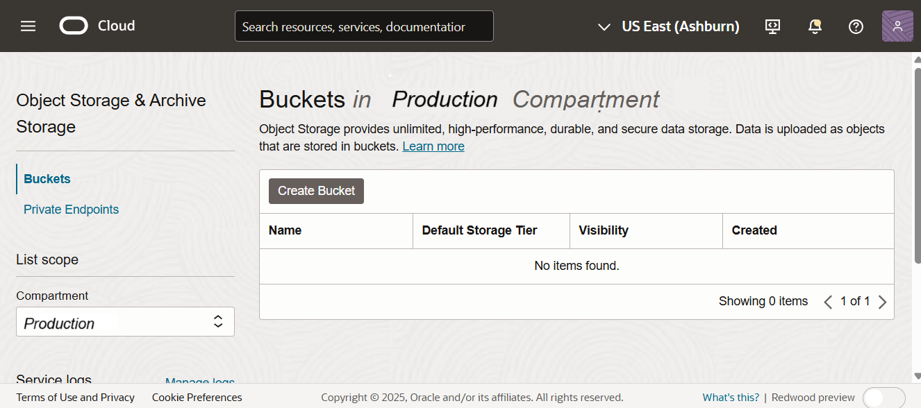 - Go to Storage > Buckets under Object Storage & Archive Storage page.