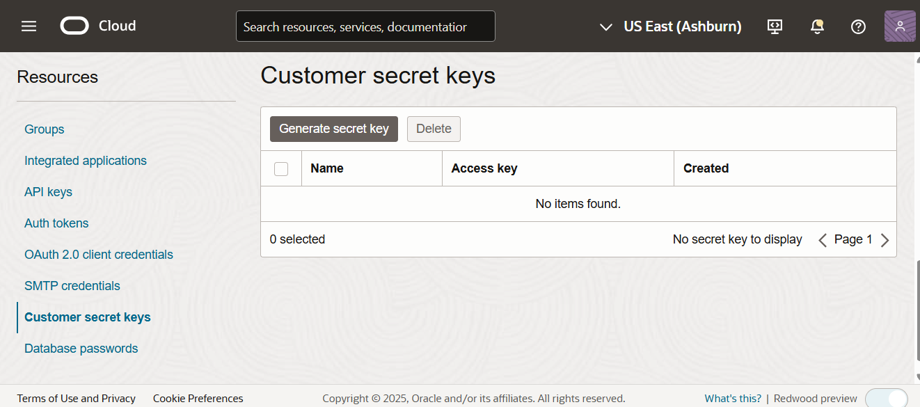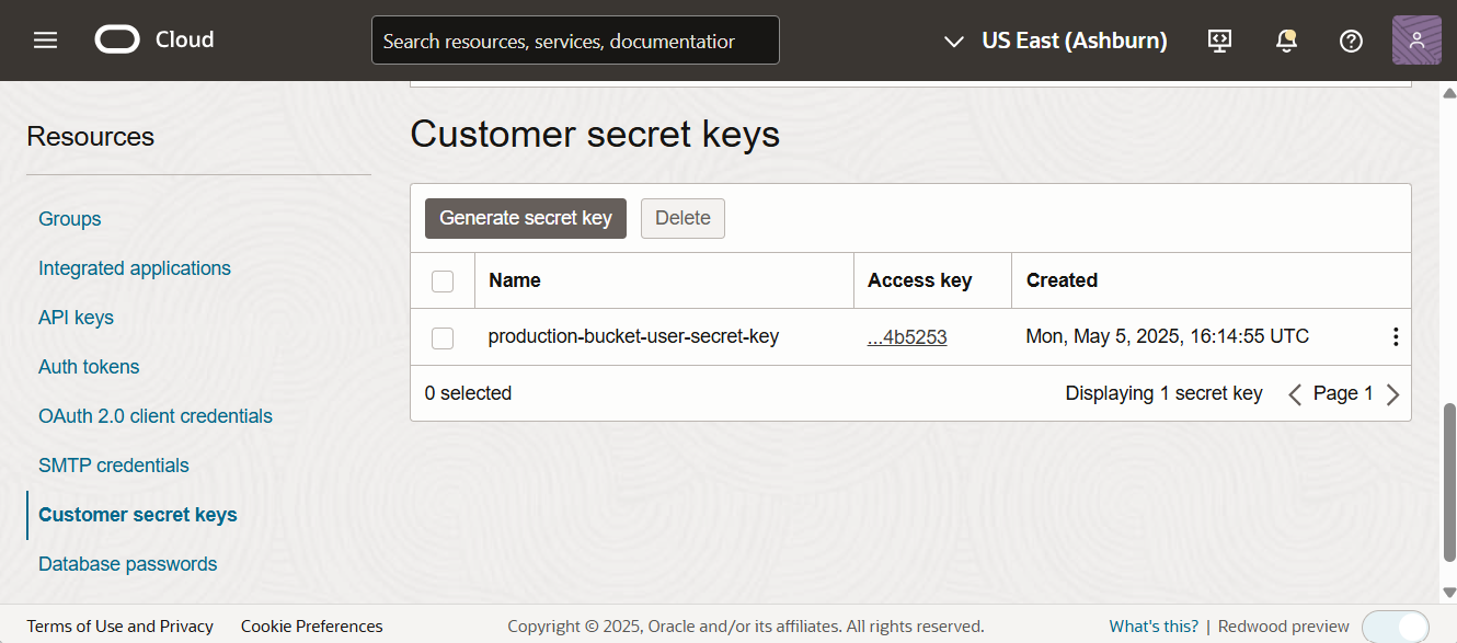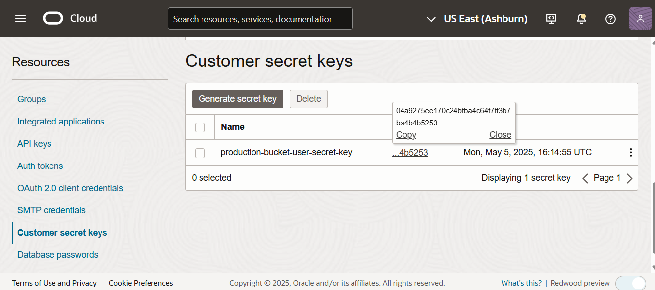 To copy the access key, go to the customer secret keys under the Resource section.