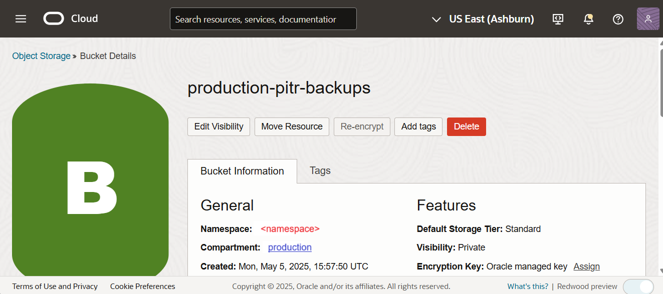 Namespace will be visible in the Bucket Details page.
